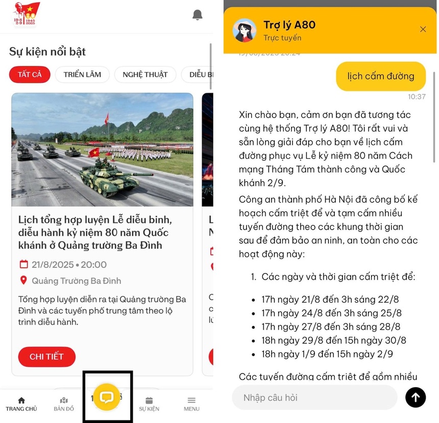 Đây là địa chỉ tin cậy để bạn đọc tìm hiểu về các hoạt động kỷ niệm Quốc khánh 2/9 như diễu binh, triển lãm, đến các thông tin hướng dẫn về an ninh - giao thông - y tế - dịch vụ… và các điểm đến không thể bỏ qua của Hà Nội trong dịp lễ trọng đại này. Ngoài ra, ứng dụng được cập nhật nhiều tính năng mới mẻ, mang đến sự tiện lợi cho người dân. Các bạn trẻ có thể tìm đọc tư liệu, lan tỏa tinh thần yêu nước qua nhiều tiện ích bổ sung từ nền tảng.