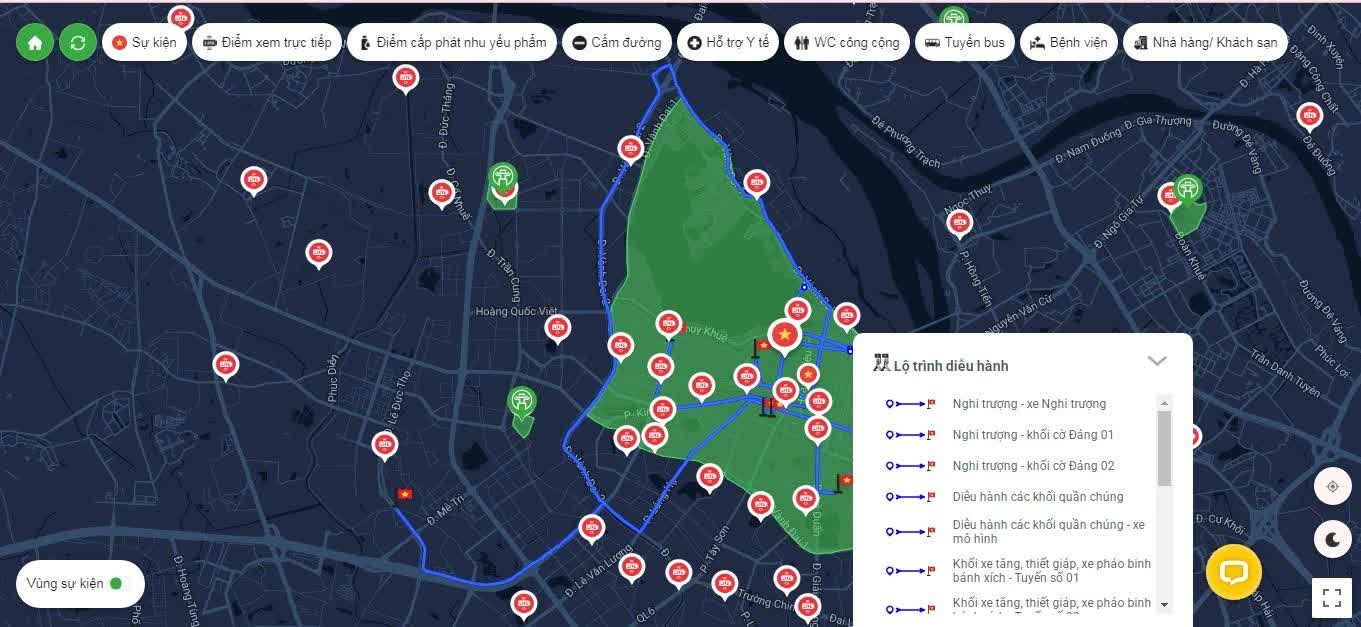 Đặc biệt, nền tảng hỗ trợ tính năng bản đồ thời gian thực, mang đến một cái nhìn tổng quan, trực quan nhất. Người dùng có thể nắm được phạm vi diễn ra hoạt động, các điểm xem trực tiếp, thời gian cấm đường. Ngoài ra, các thông tin về giao thông công cộng, điểm cấp phát nhu yếu phẩm, nhà vệ sinh, hay điểm hỗ trợ y tế, nhà hàng, khách sạn đều được thể hiện đầy đủ.